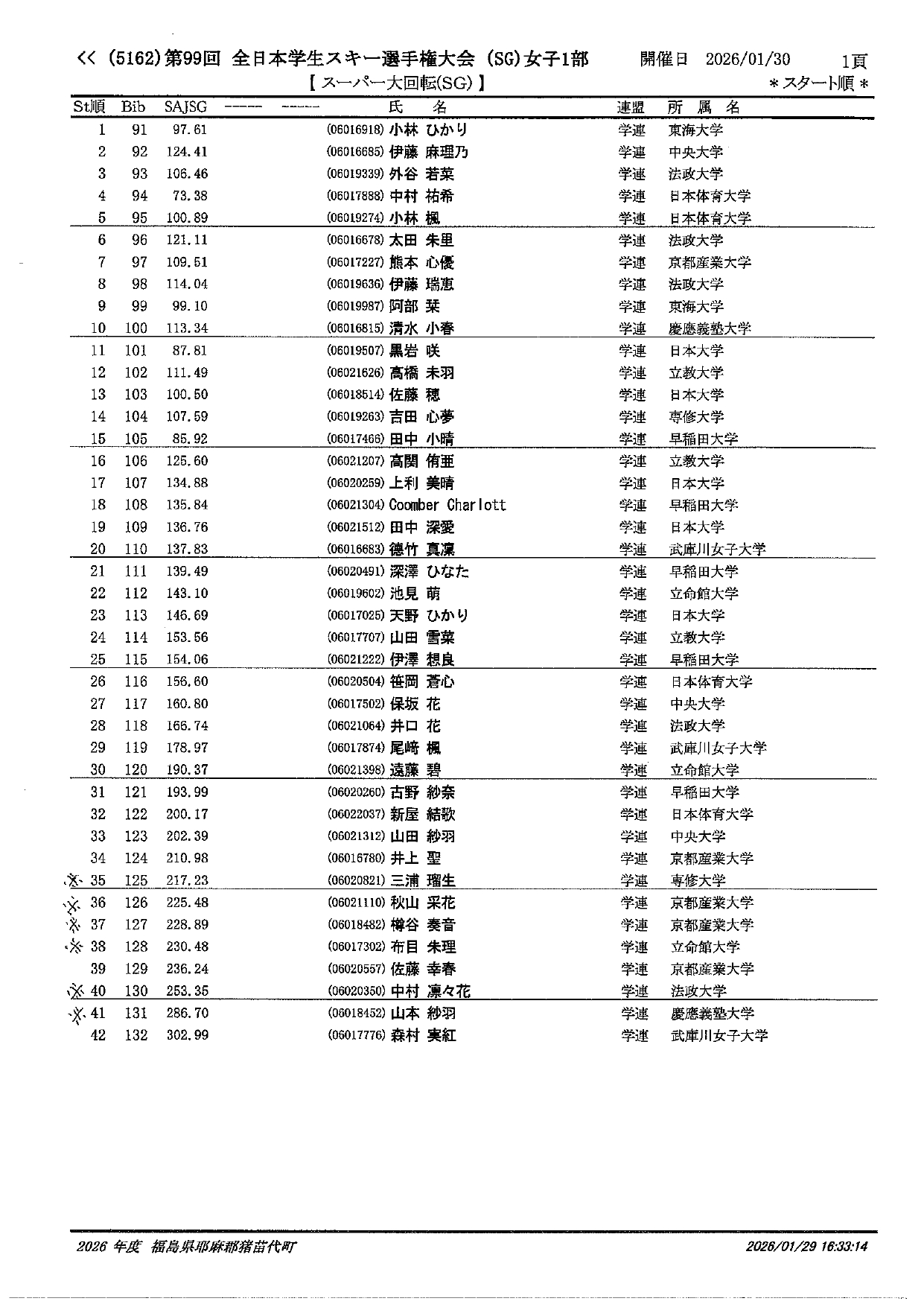 1月30日「秩父宮杯・秩父宮妃杯第99回 全日本学生スキー選手権大会」女子のスタートリストを掲載しました。