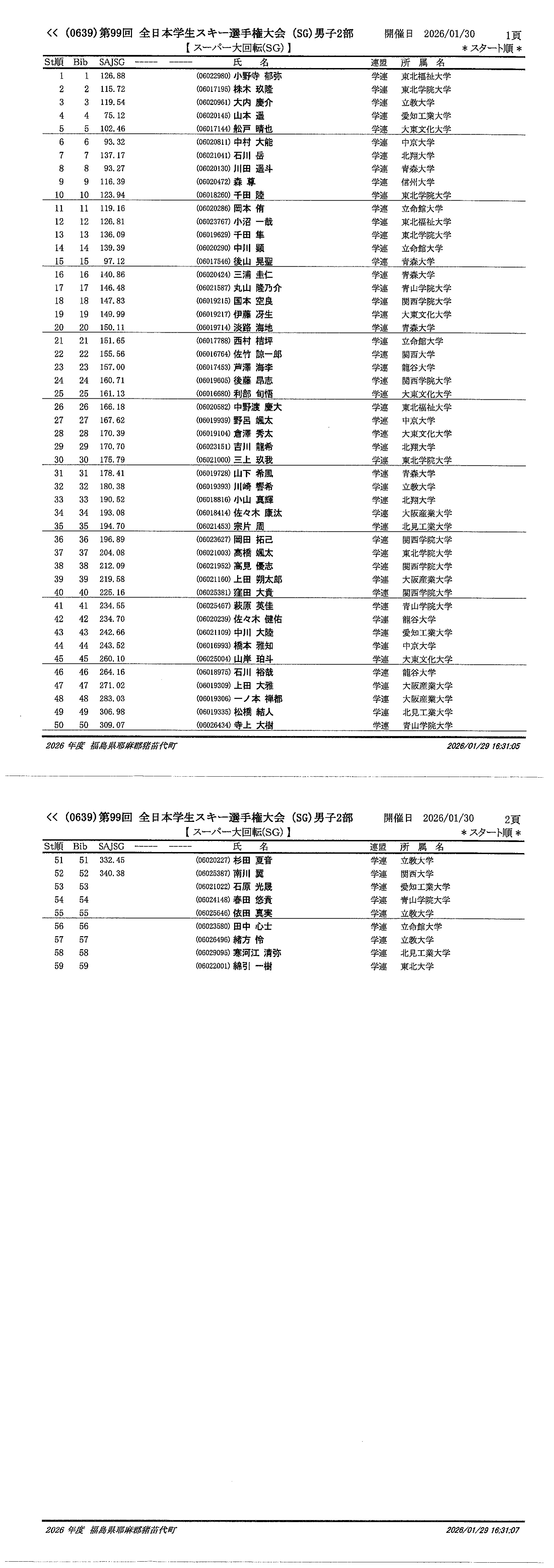 1月30日「秩父宮杯・秩父宮妃杯第99回全日本学生スキー選手権大会 」男子2部のスタートリストを掲載しました。