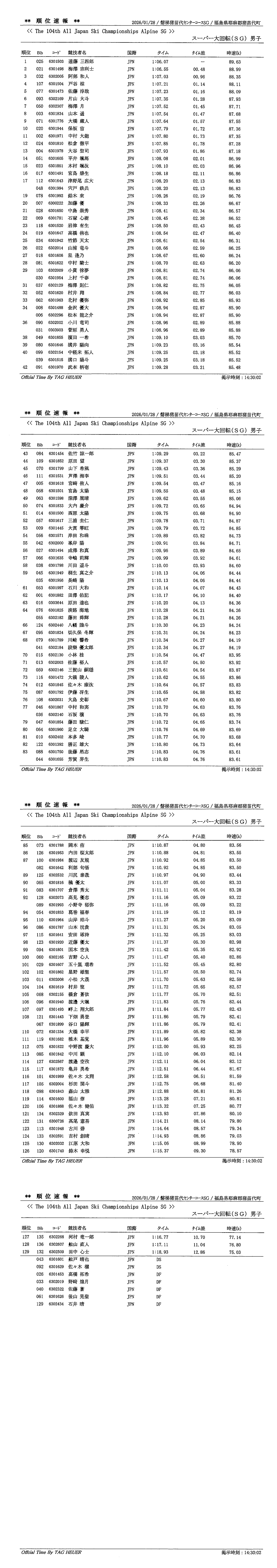 第104回全日本スキー選手権大会スーパー大回転(SG)男子の順位を掲載しました。